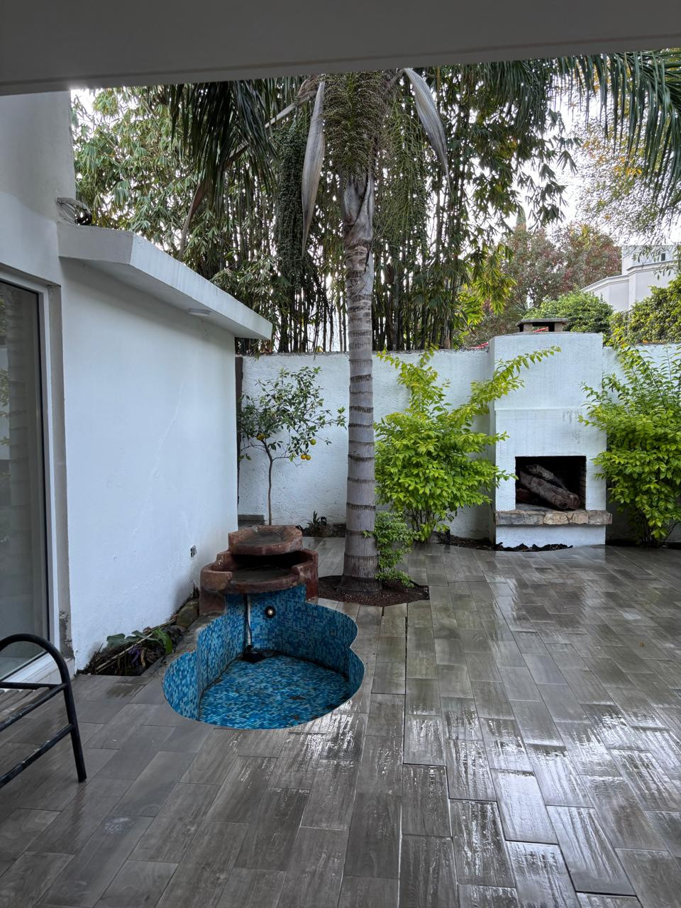 ✅ Jardín con pequeña fuente y barra